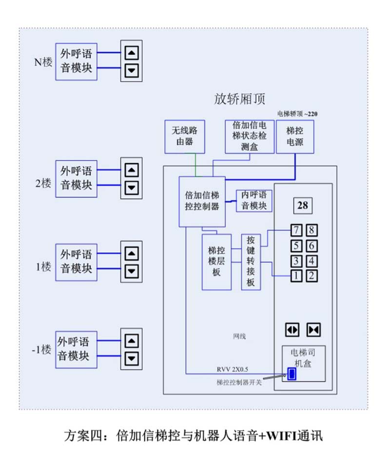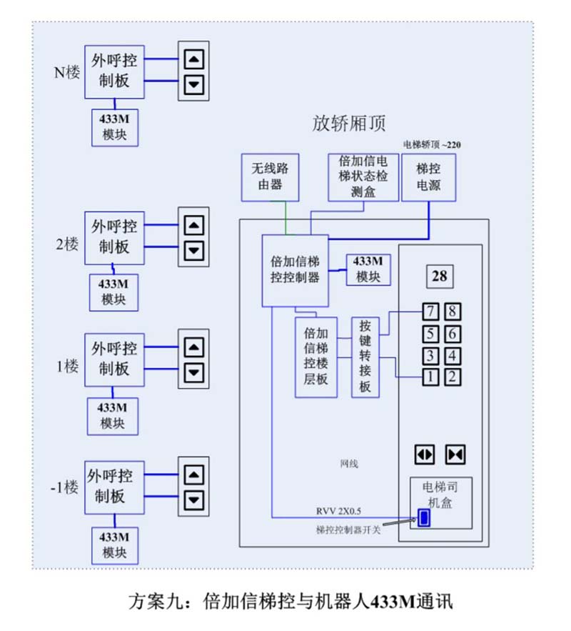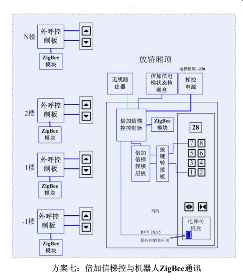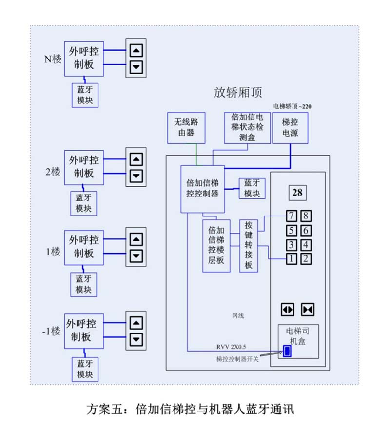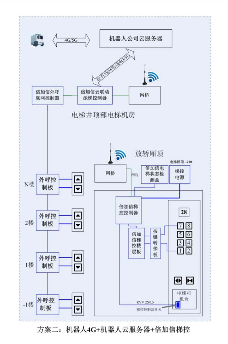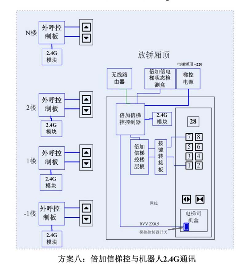 (1)機(jī)器人在電梯外,通個(gè)Wifi、藍(lán)牙、LoRa、Zigbee、2.4G、433M、語音或4G網(wǎng)絡(luò)等發(fā)送指令倍加信梯控系統(tǒng),系統(tǒng)自動(dòng)點(diǎn)亮上樓或下樓按鍵,實(shí)現(xiàn)呼梯功能。