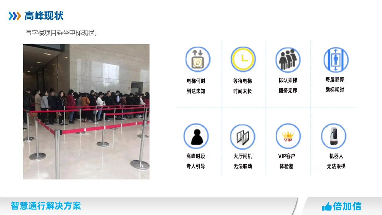 在寫字樓場所,早晨上班高峰期、午高峰、下午下班晚高峰,經(jīng)常出現(xiàn)出現(xiàn)排長隊(duì)擁堵情況,高峰期電梯運(yùn)力不足成為所有寫字樓物業(yè)管理的痛點(diǎn)。