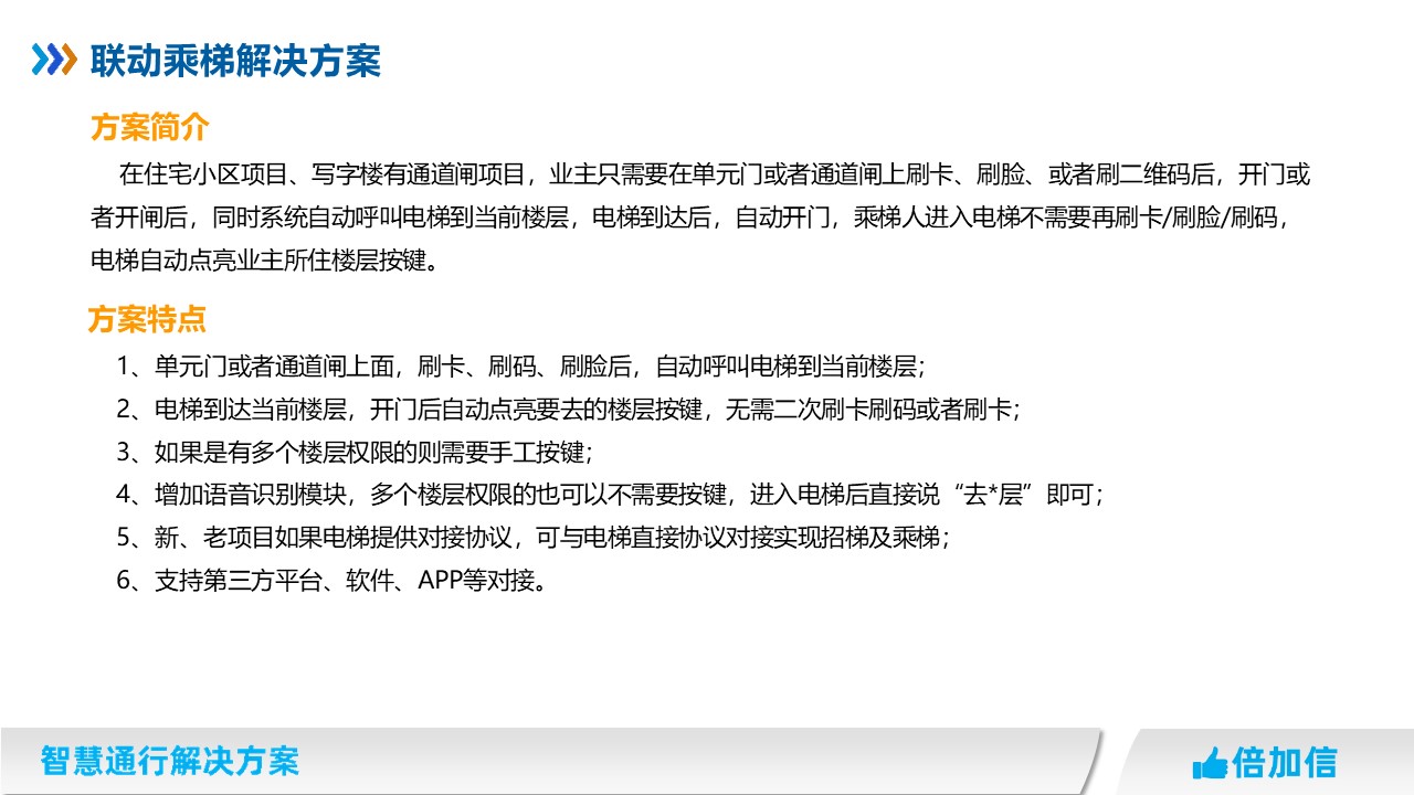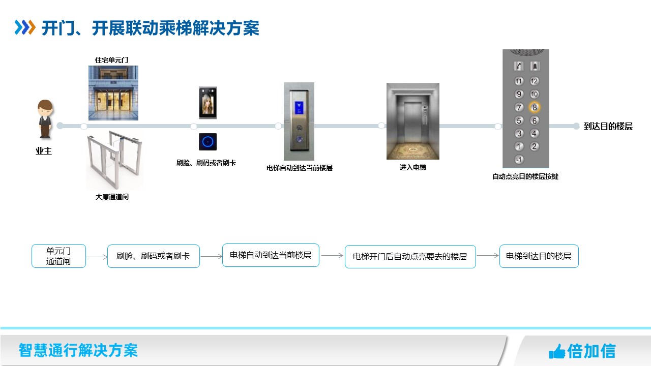 在住宅小區(qū)項(xiàng)目、寫字樓有通道閘項(xiàng)目,業(yè)主只需要在單元門或者通道閘上刷卡、刷臉、或者刷二維碼后,開門或者開閘后,同時系統(tǒng)自動呼叫電梯到當(dāng)前樓層,電梯到達(dá)后,自動開門,乘梯人進(jìn)入電梯不需要再刷卡/刷臉/刷碼,電梯自動點(diǎn)亮業(yè)主所住樓層按鍵。