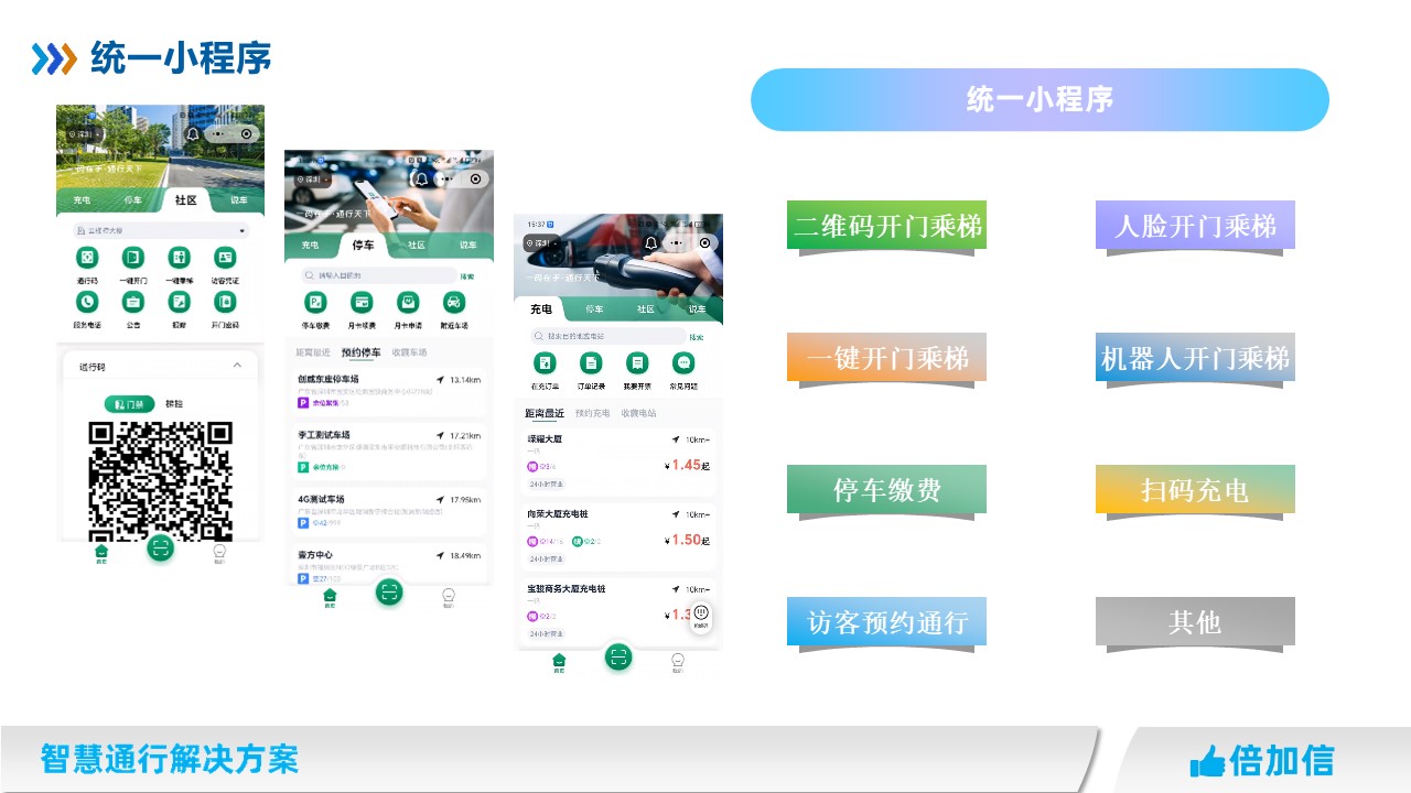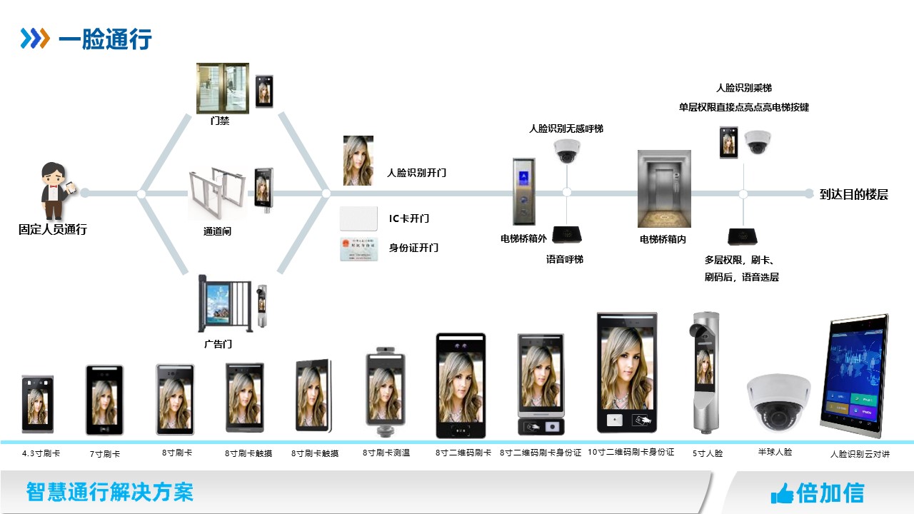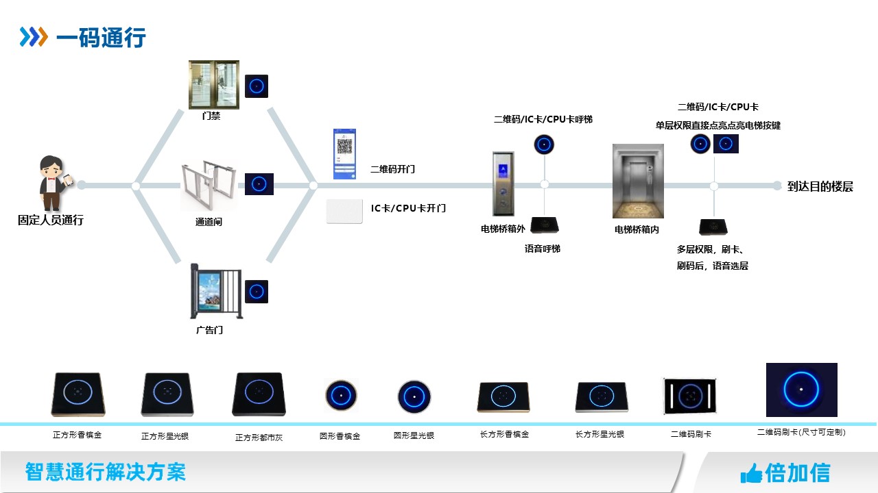 固定人員在門禁系統(tǒng)、梯控系統(tǒng)、通道閘系統(tǒng)、停車場(chǎng)系統(tǒng)、廣告門等系統(tǒng),實(shí)現(xiàn)一碼通行、一卡通行、一臉通行。