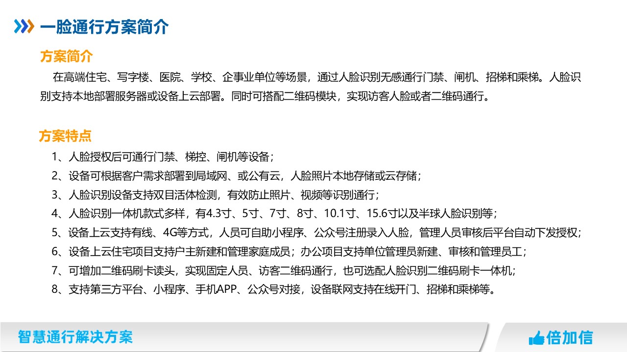 在高端住宅、寫字樓、醫(yī)院、學(xué)校、企事業(yè)單位等場(chǎng)景,通過(guò)人臉識(shí)別無(wú)感通行門禁、閘機(jī)、招梯和乘梯。人臉識(shí)別支持本地部署服務(wù)器或設(shè)備上云部署。同時(shí)可搭配二維碼模塊,實(shí)現(xiàn)訪客人臉或者二維碼通行。