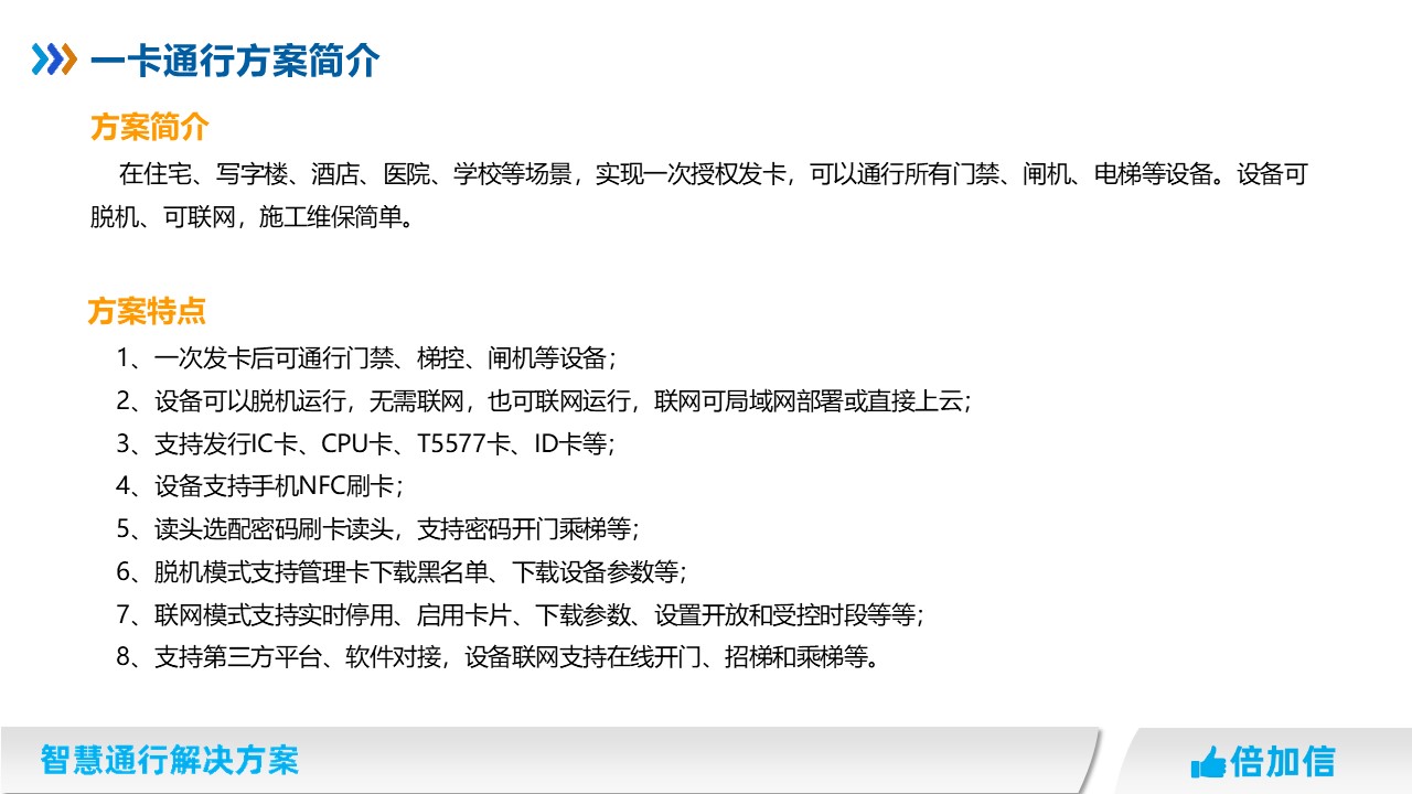 在住宅、寫字樓、酒店、醫(yī)院、學(xué)校等場(chǎng)景,實(shí)現(xiàn)一次授權(quán)發(fā)卡,可以通行所有門禁、閘機(jī)、電梯等設(shè)備。設(shè)備可脫機(jī)、可聯(lián)網(wǎng),施工維保簡(jiǎn)單。