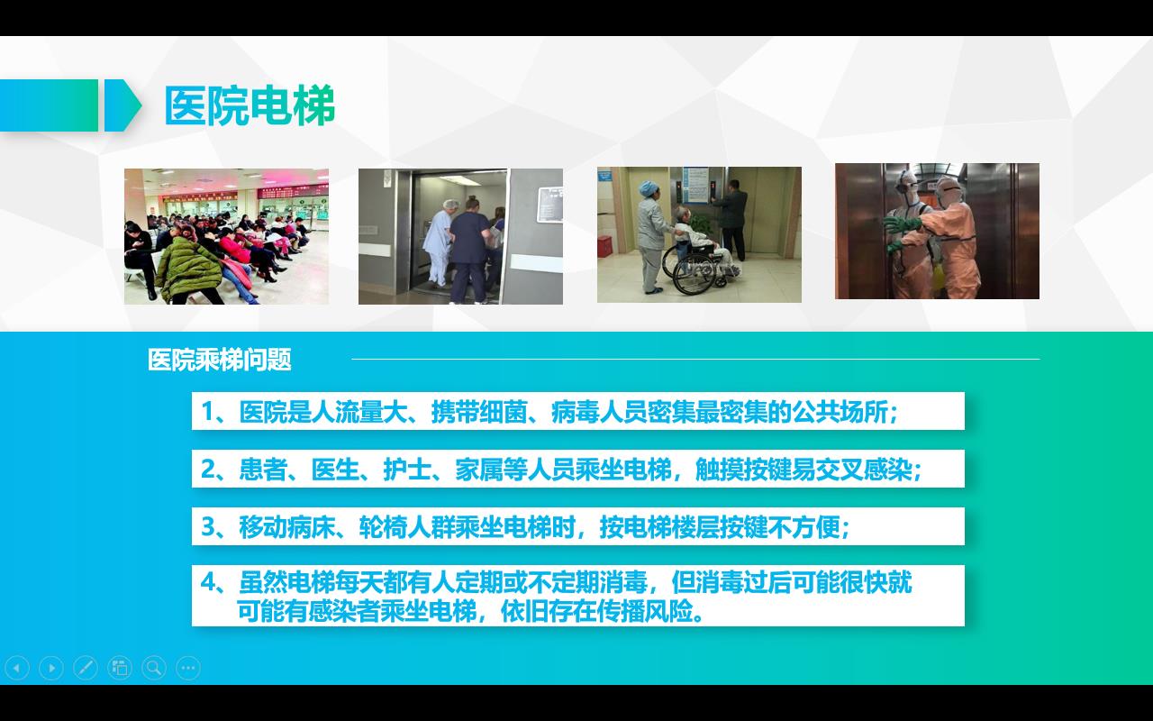 2、患者、醫(yī)生、護(hù)士、家屬等人員乘坐電梯,觸摸按鍵易交叉感染;