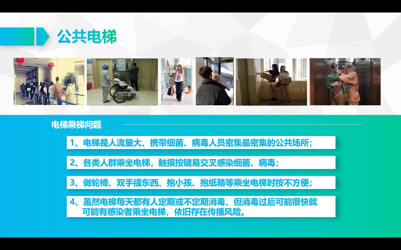 1、電梯是人流量大、攜帶細(xì)菌、病毒人員密集最密集的公共場所;