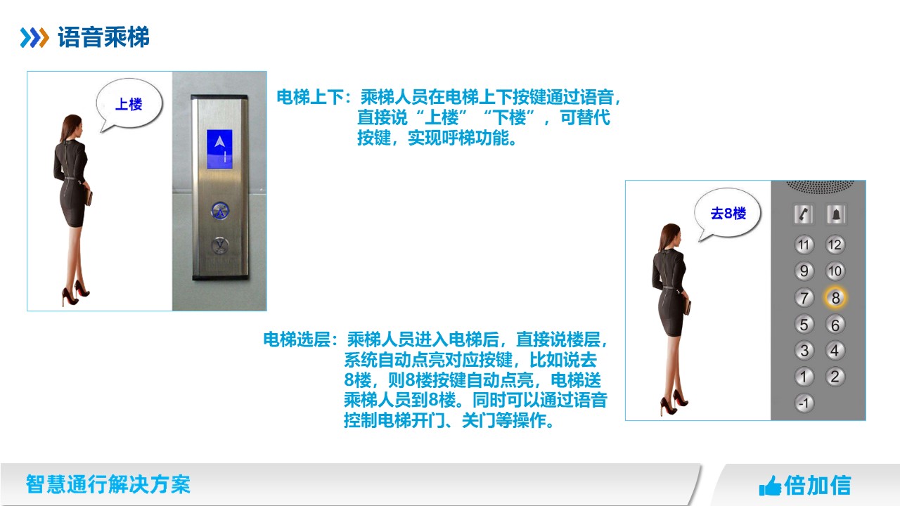 倍加信科技作為專業(yè)的梯控系統(tǒng)研發(fā)廠家,推出真正零接觸的乘梯方案。不判斷樓層權(quán)限,全程通過語音識別實(shí)現(xiàn)呼梯和乘梯。