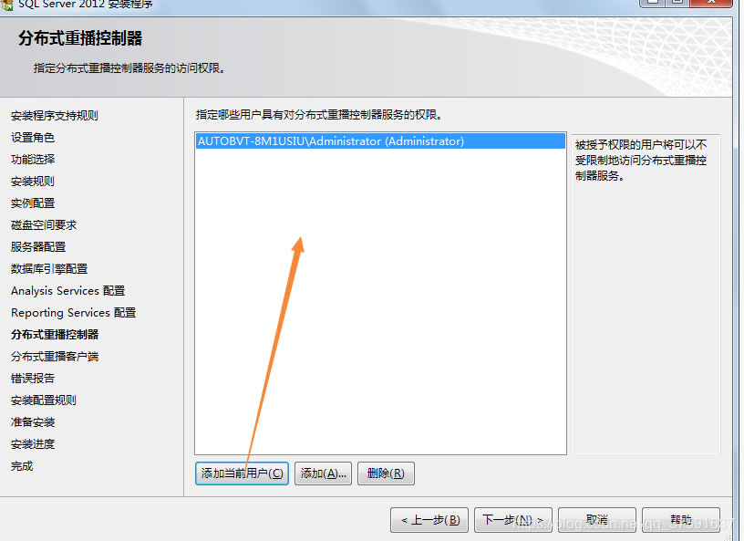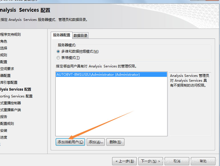 Analysis Services配置,選擇“添加當(dāng)前用戶”;