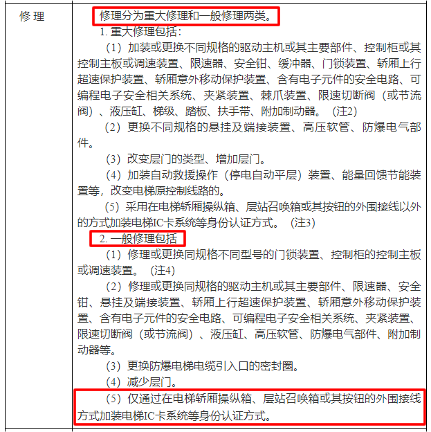1. 重大修理包括:(5)采用在電梯轎廂操縱箱、層站召喚箱或其按鈕的外圍接線以外的方式加裝電梯IC卡系統(tǒng)等身份認(rèn)證方式。