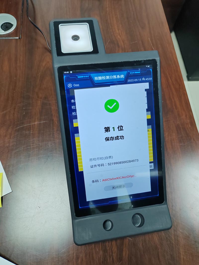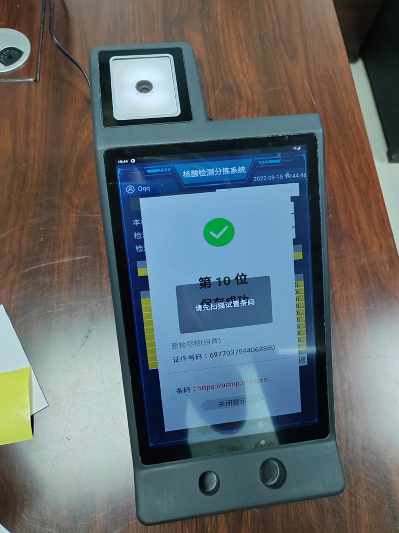 2.、做核酸人員掃核酸碼,系統(tǒng)提示采集成功,同時工作人員拿棉簽